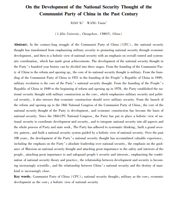 Xiao Xi, Wang Yimin, "On the Development of the National Security thought of the Communist Party of China in the Past Century"