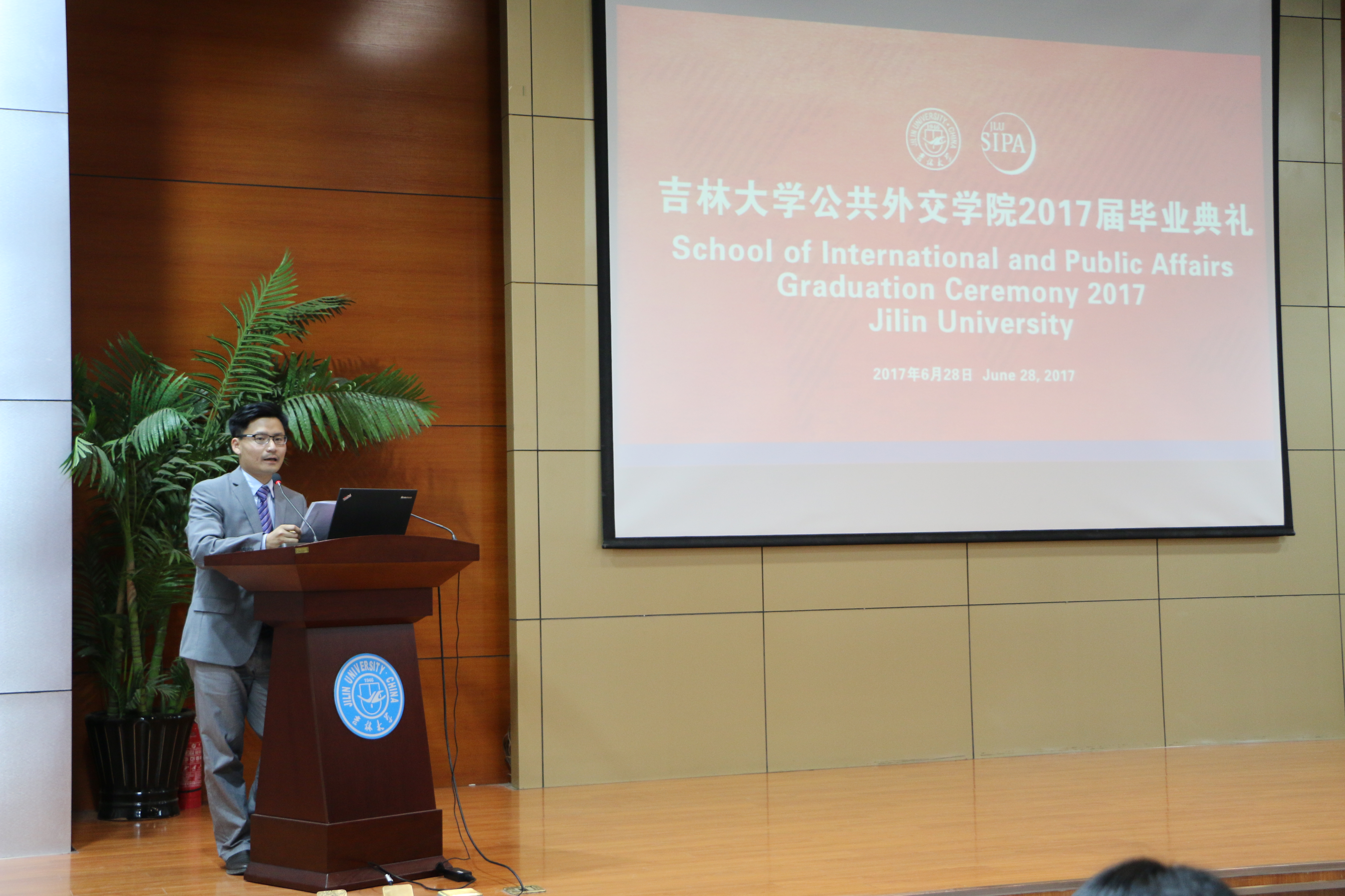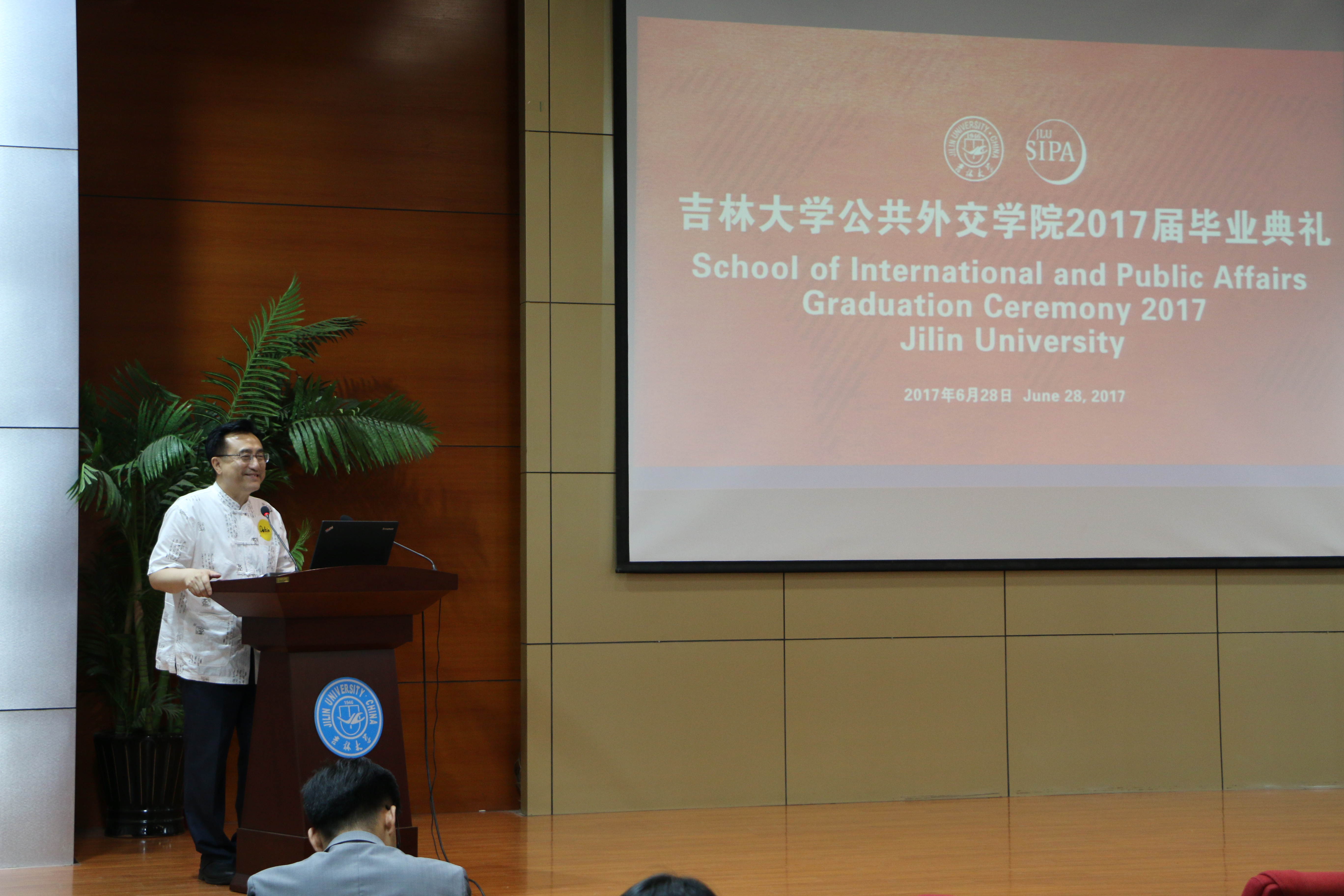 最后,刘德斌院长做了热情洋溢、语重心长的讲话。他首先向圆满完成学业的2017届毕业生们表示热烈的祝贺。他从自己早年的海外留学经历出发,鼓励学生们要勤于学习,善于思考,掌握知识的同时更要培养学习的能力。刘德斌院长寄语毕业生们要把握时代浪潮,担当时代重任,在学习中进步,在实践中成长,回国后在各自的工作岗位上有所建树,运用在中国留学期间所获得的智慧和与50多个国家学生交往的经验,为中国和世界各国人民之间的友好交往多做贡献,为各自国家和民族的发展,为全人类的共同进步,做出自己的努力。