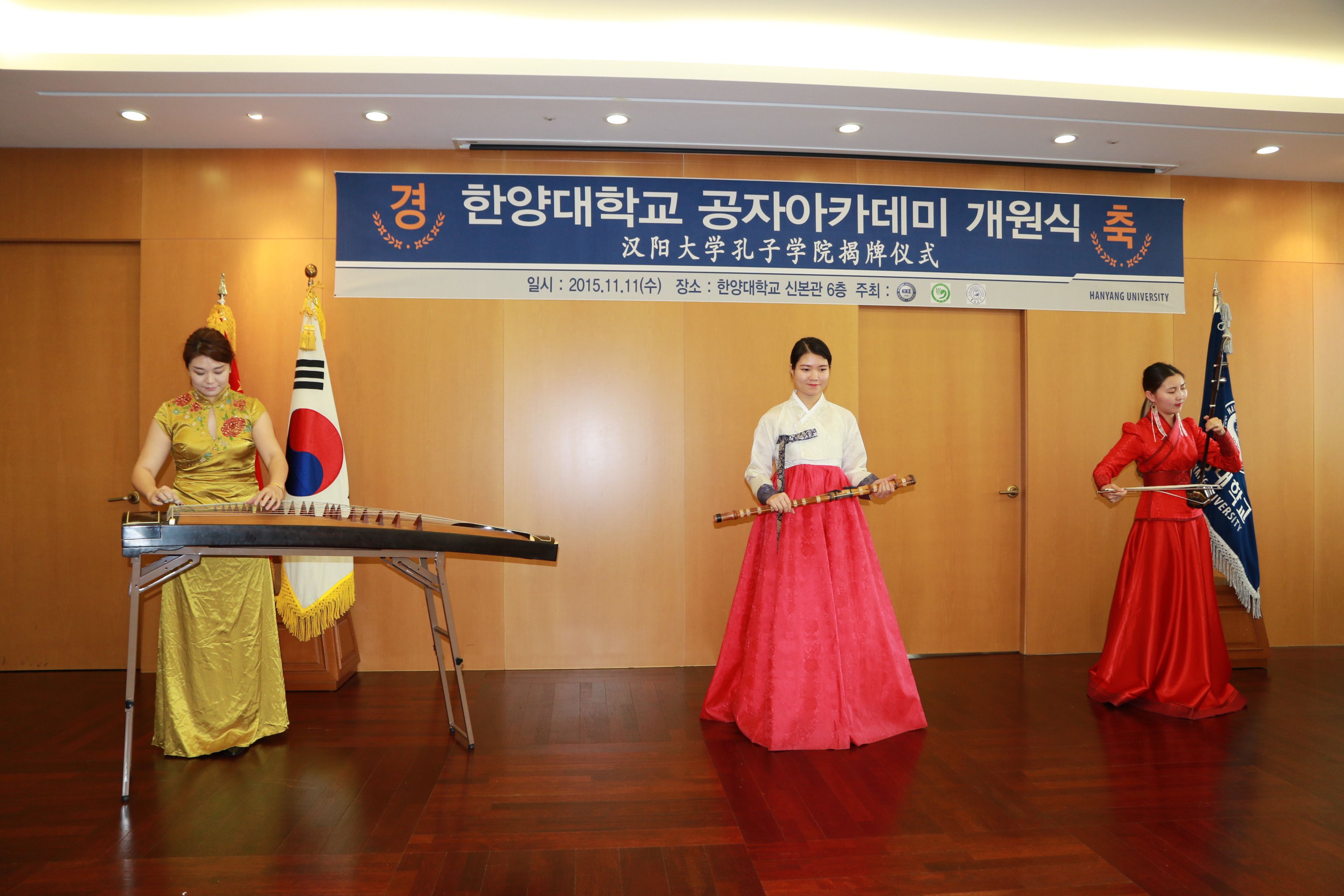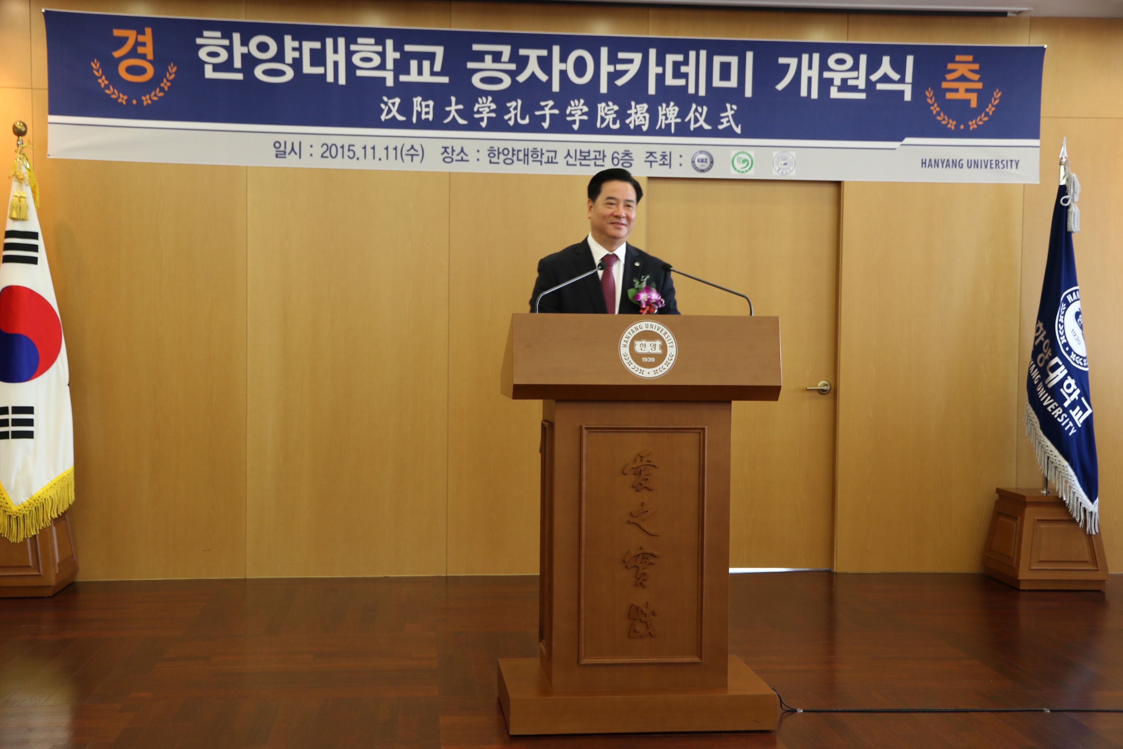 的相关负责同志出席了李校长汉阳大学名誉教授受聘仪式和孔子学院揭牌仪式。汉阳大学常务副校长金会律、副校长李承哲、国际交流处处长李基晶、国际语学院院长兼孔子学院韩方院长徐元南和国际学大学院院长兼中国问题研究所所长文兴镐等出席了揭牌仪式,并和李校长等一起为孔子学院剪彩。韩国其他大学孔院的中外方院长及汉阳大学国际语学院的中文教师和学生代表共一百余人出席了汉阳大学孔子学院的揭牌仪式。揭牌仪式后,两校还共同召开了汉阳大学孔子学院理事会首次工作会议,就今后的工作进行了细致的讨论,并通过了一系列章程和规定。