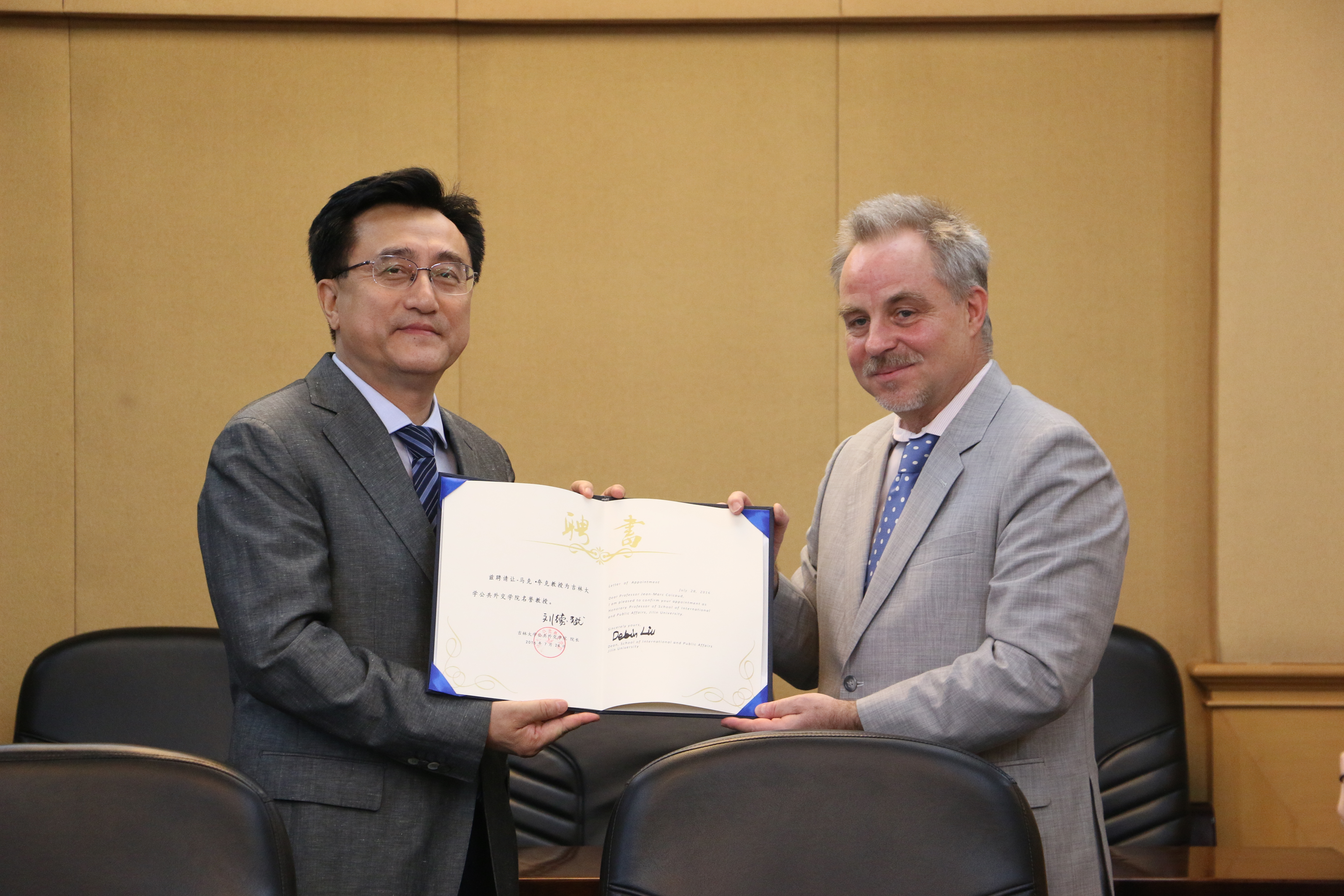 院长刘德斌教授会见了夸克教授。刘德斌首先对夸克教授的来访表示热烈欢迎,并就双方如何更好地开展的“联合国与全球政策研究硕士研究生‘4+1’项目”,合作建立联合国研究机构,共同开展联合国与全球政策研究等事宜与夸克教授进行了深入的探讨。夸克教授表示联合国与全球政策研究是当今世界的热点学科,将竭尽全力在人才联合培养、高层次专家学者交流等方面进一步推进双方合作。