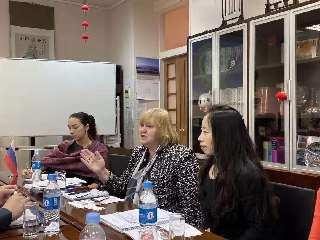 以远东联邦大学孔子学院娜塔莉娅•约瑟福夫娜副院长和近十位孔院教职人员与师生代表会见并展开座谈。