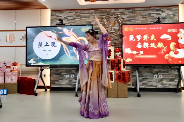 教职工呈现出一场精彩绝伦的视听盛宴。开场舞《拜新年》以欢快的节奏和喜庆的氛围,展示了无限活力与激情,将祝福与欢乐传递到现场的每一个角落。敦煌舞《壁上观》以独特的舞姿和深厚的文化底蕴,带领观众穿越时空,领略了丝绸之路的辉煌历史和多元文化。歌曲《大鱼》用音乐诉说心声,将真挚的情感传递得淋漓尽致,让教职工们仿佛置身于音乐的海洋之中,陶醉不已。诗朗诵《沁园春·雪》大气磅礴、震撼人心,让观众们感受到了毛泽东同志“改造中国与世界”的宏伟理想和乐观自信,表达了在新的长征路上坚定不移跟党走的政治信念。