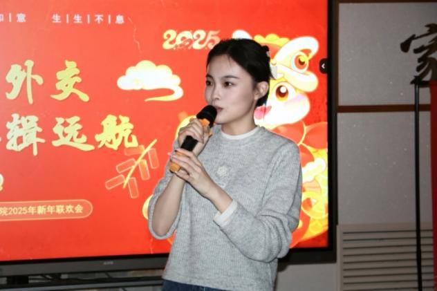 在此举办“筑梦外交 奋辑远航”2025年教职工新年联欢会。活动现场彩灯高悬、暖意融融,笑声、掌声和欢呼声交织连片。学院领导班子及全体教职工济济一堂,在欢声笑语中共贺新年。