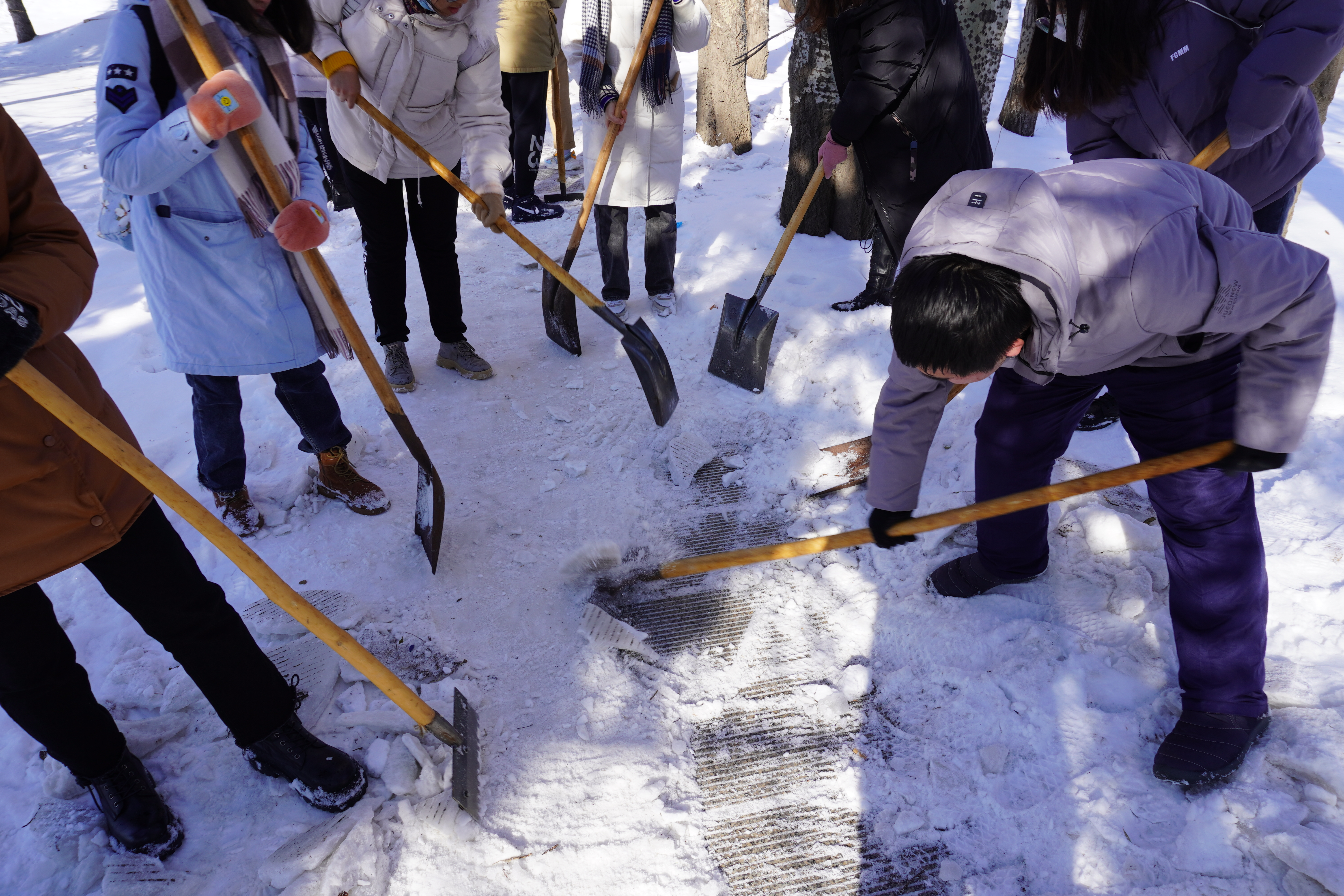 党委组织入党积极分子在篮球场旁的小路上进行了除雪活动。