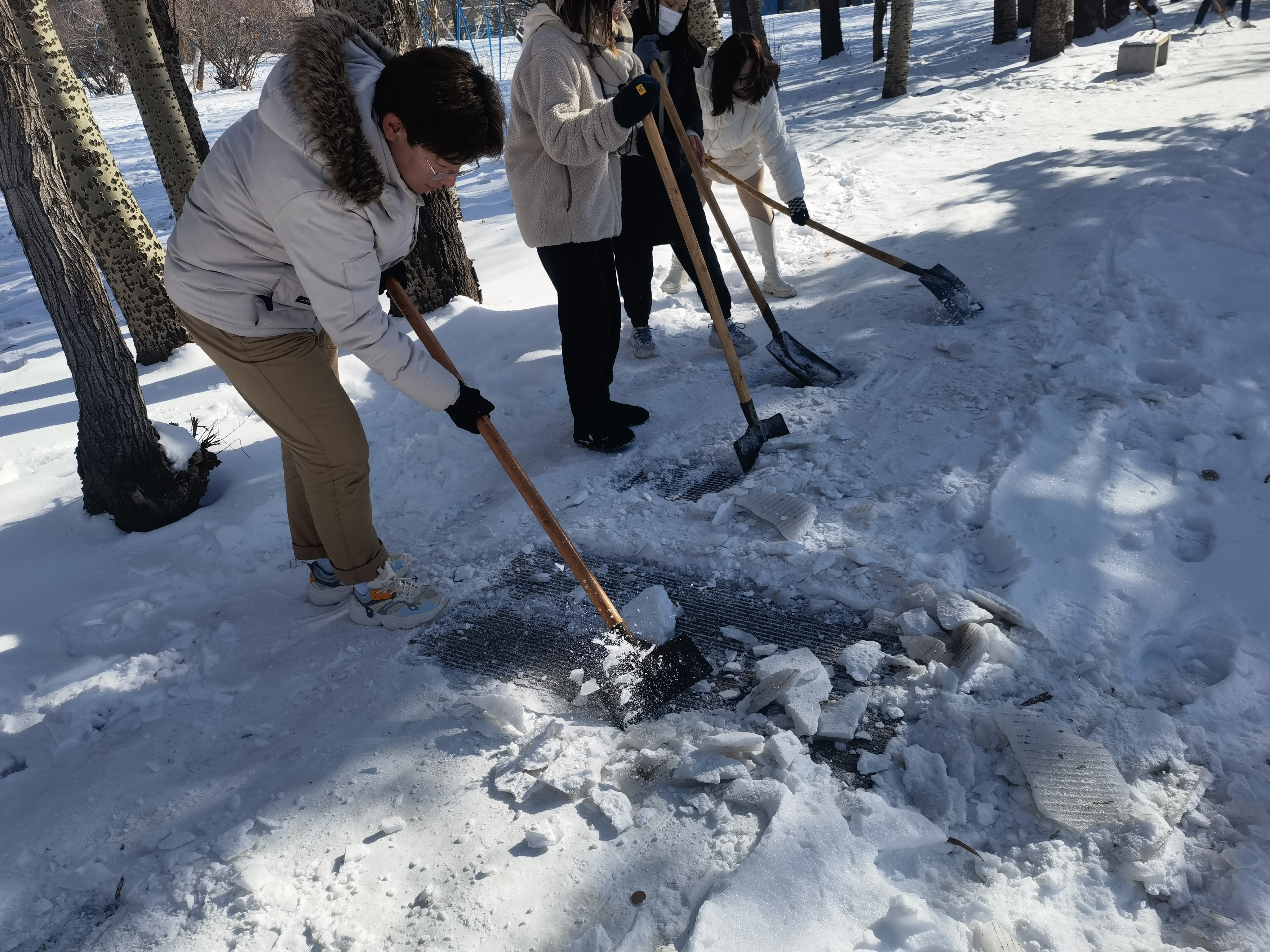 在学院的组织安排下,三十多名入党积极分子带上铲雪的工具,一齐来到了篮球场旁的小路上,很快地投入了热火朝天的劳动中。路面结冰较厚,较难铲动,女生们力气较小,便负责松动冰面以及将冰块运到路边,而男生们力气较大,便负责将冰铲起。大家分工明确、紧密配合,氛围其乐融融,工作紧锣密鼓地进行地同时又充满了欢声笑语。天气很冷,但是同学们除雪的热情不减,充分地展现了学子的昂扬向上的精神面貌和不辞辛苦服务他人的品格。经过一个多小时的辛苦铲雪工作后,将负责的区域的积雪进行清扫,为行人开辟出了一条安全的道路,扫雪任务基本完成,消除了因大雪天气导致的安全隐患,为师生的安全出行提供了方便