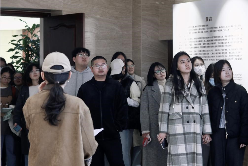 进入校史馆的序厅,“求实创新,励志图强”的校训跃然眼前。在讲解员屈美希同学的讲述下,同学们首先了解了校训、校徽、校歌所蕴涵的深刻教育精神和丰富文化内涵。