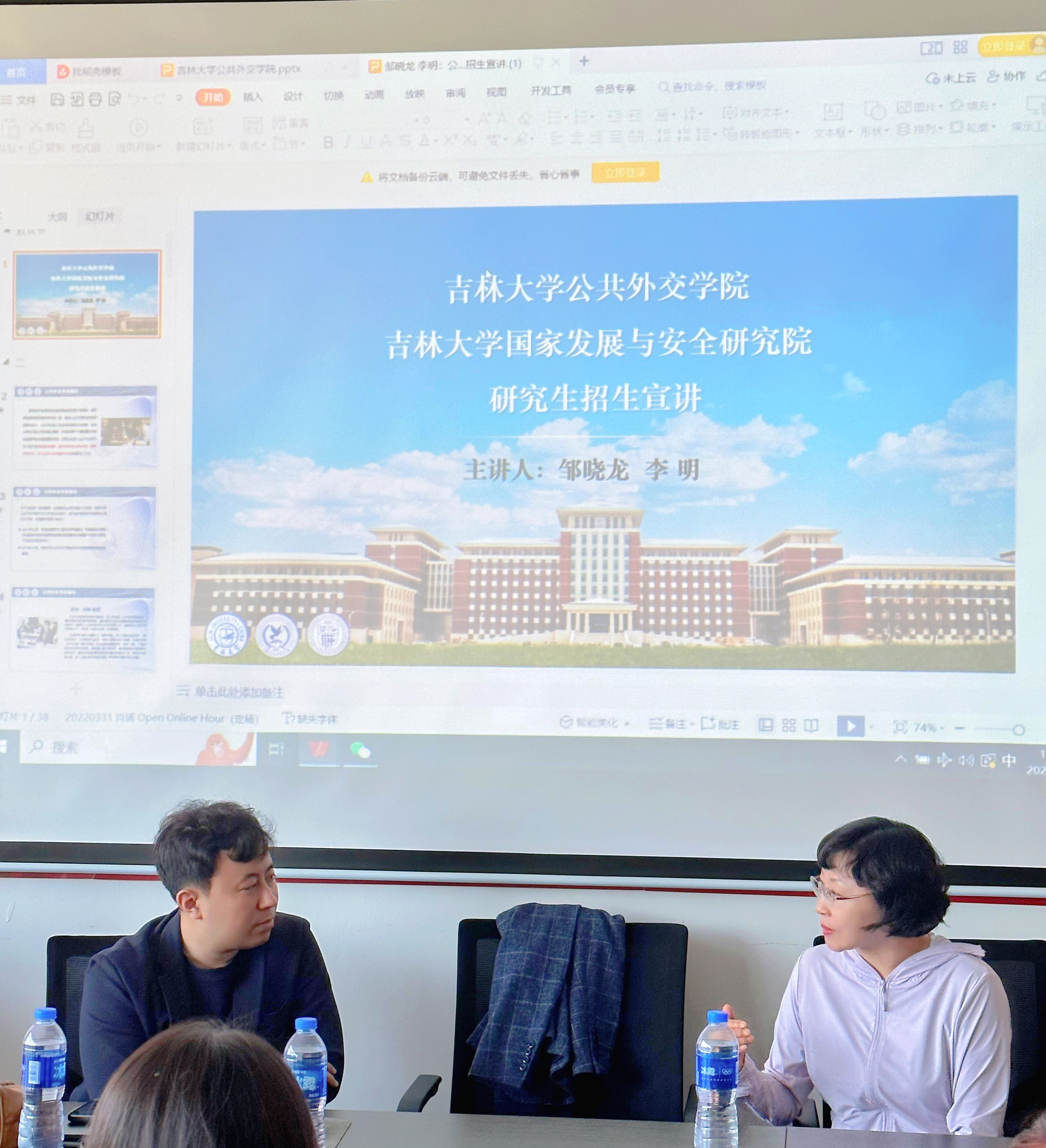 活动伊始,大连外国语大学国际关系学院党委书记郝利群副教授代表国际关系学院欢迎了两位老师的到来。本次招生宣讲会由大连外国语大学国际关系学院王家曦老师主持,国际事务与国际关系教研室主任王琳老师以及相关专业的学生出席了本次宣讲会。