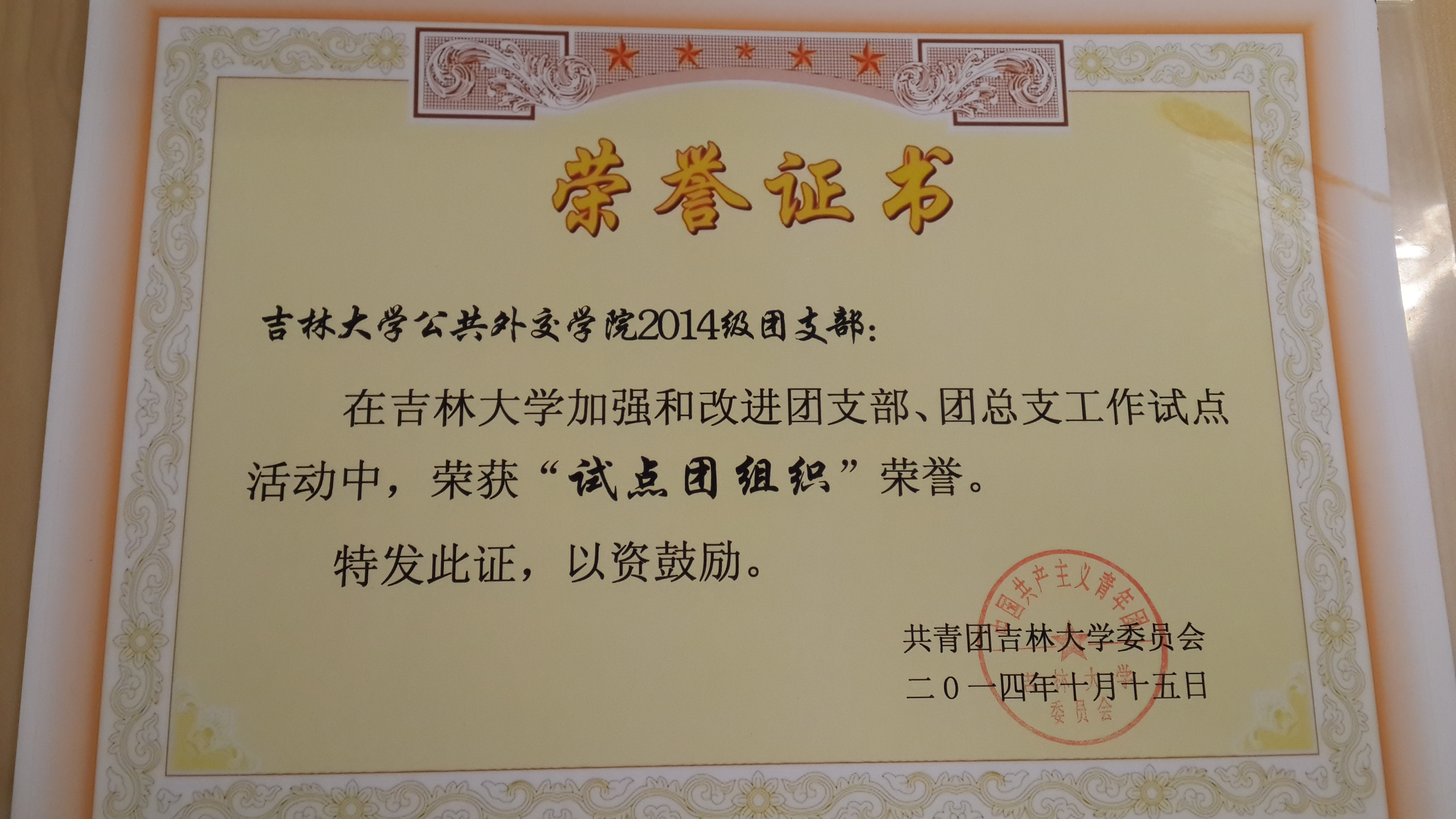 加强和改进团支部、团总支工作试点活动中,荣获“试点团组织”,并获荣誉证书。