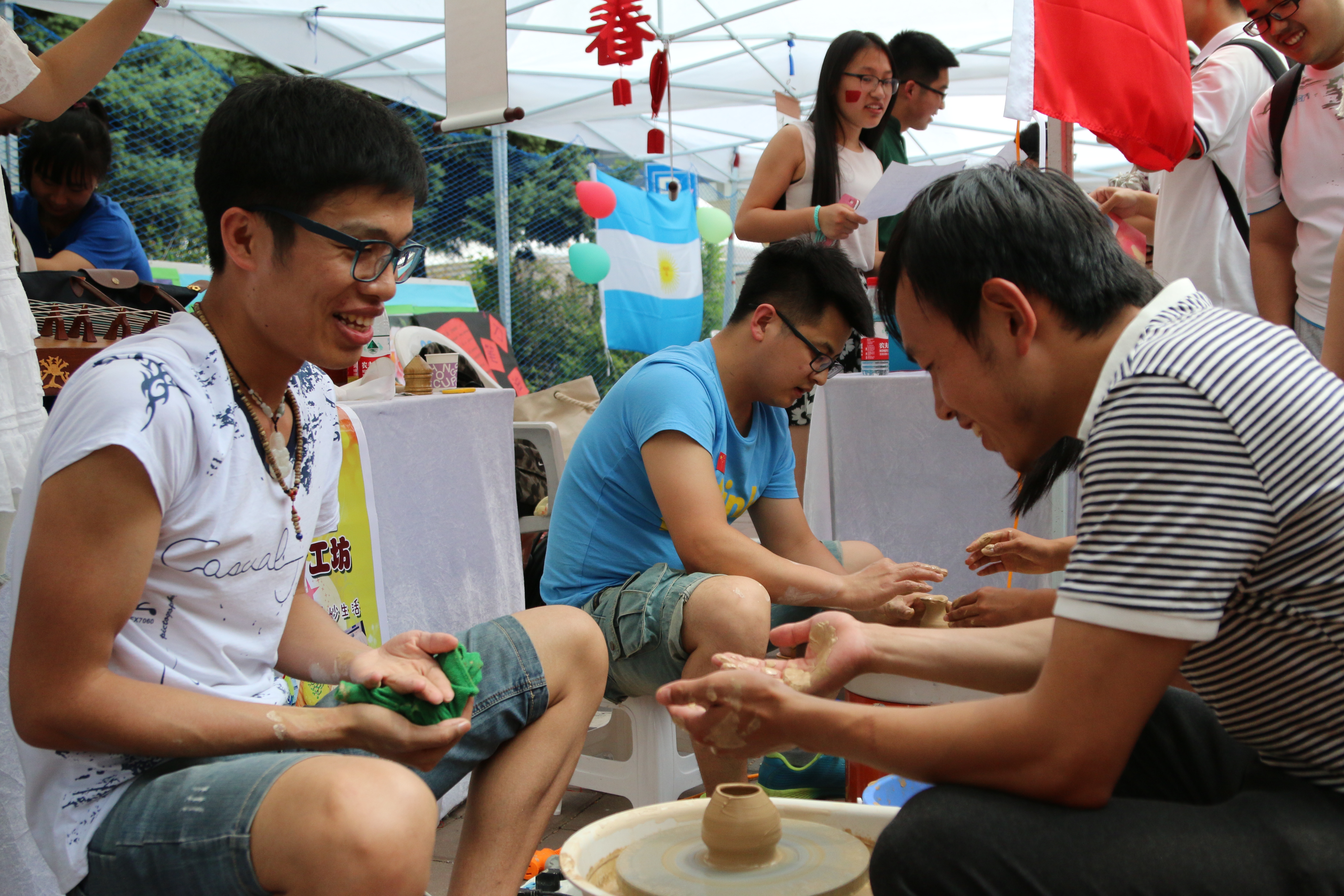 举行的文化日活动。新成立的“Together”社团全程负责了这次文化日中国馆的布置、管理工作。“Together”社团的同学为中国馆设计了三个体验环节,分别是回答和中国文化相关的题目、亲自制作陶艺花瓶、穿上汉服、唐服并拍照留念。前来参观中国馆的朋友可以分别体验这三个环节,充分参与到中国文化的体验活动中,许多参与体验的留学生说着有些生涩的汉语回答中国文化问题,场面十分有趣。并且很多人是第一次亲身体验陶艺制作,虽然双手沾满了陶艺泥巴,不过看到自己亲自制作出来的陶艺罐子,相信他们的心里充满了成就感。