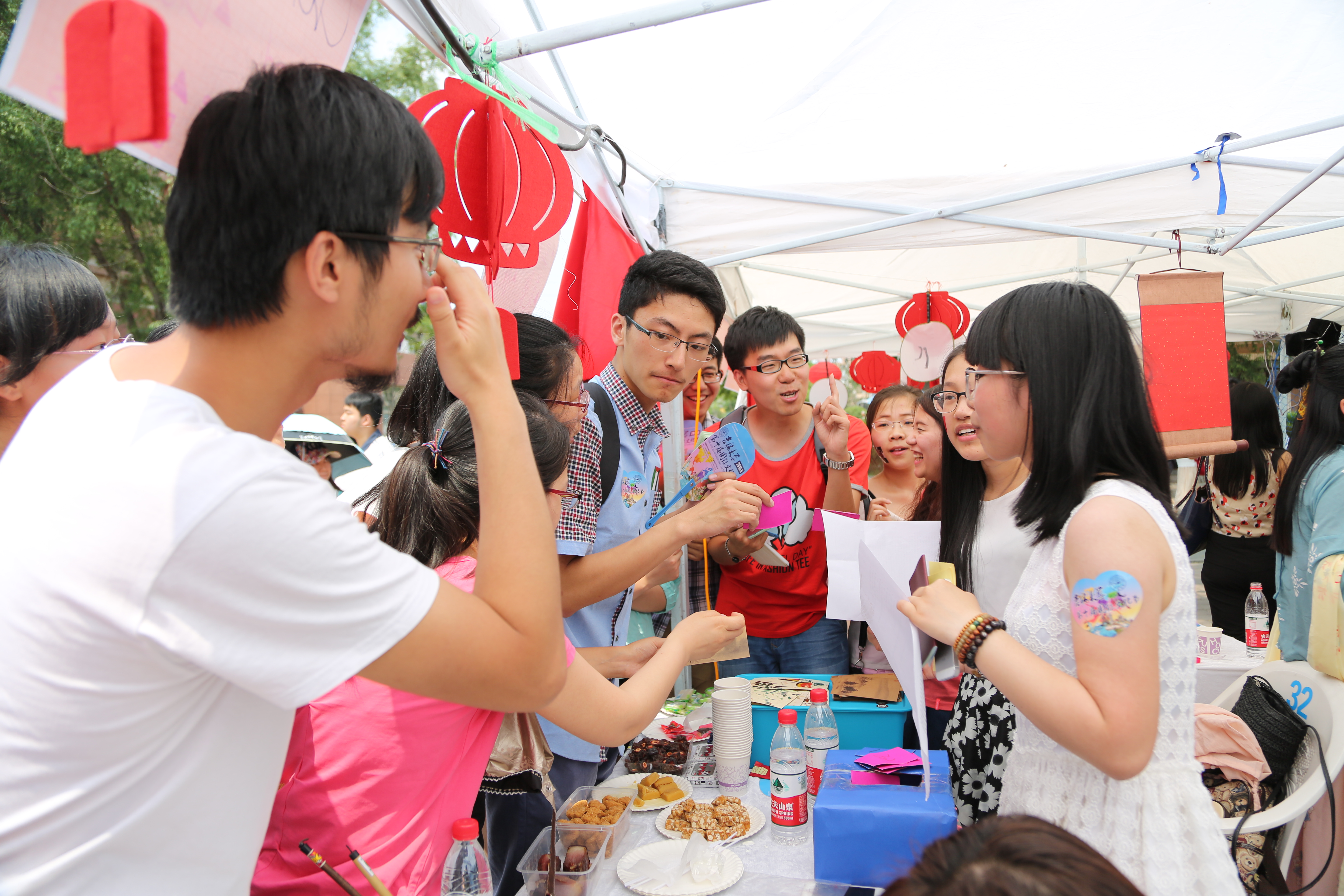 今天天气十分炎热,文化日从早上十点开始,到傍晚六点结束。许多“Together”社团的同学全程参与,非常辛苦。甚至有作为工作人员负责引导体验者的女同学一直坚持在岗位,直到中暑才另让别的同学来替换。“Together”社团同学的献身投入让人为之感动。
