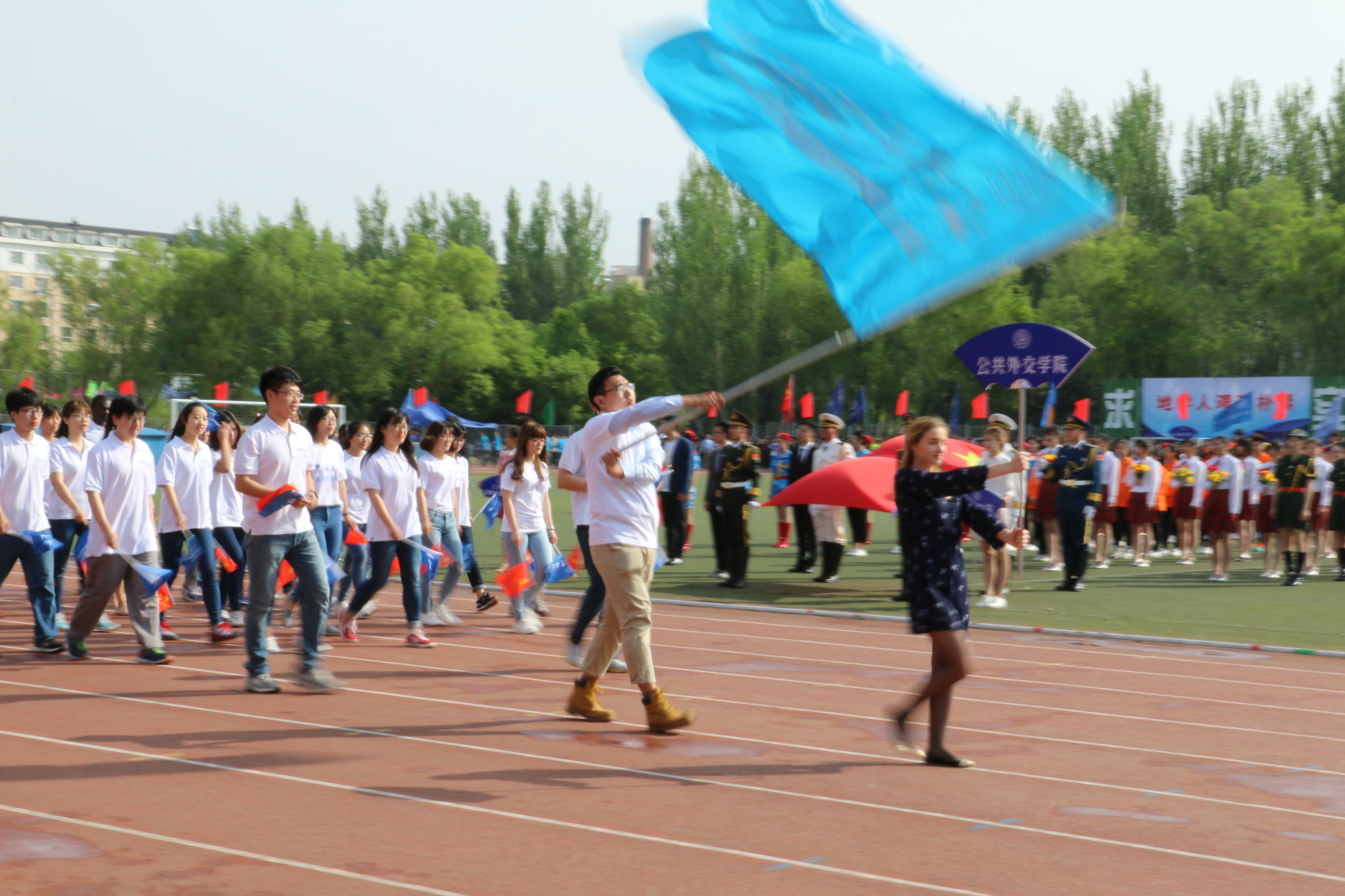 方队因中外学生结合而独具特色。中英结合的口号,各具特色的国旗,整齐鲜明的服饰均给在场观众留下了深刻的印象。