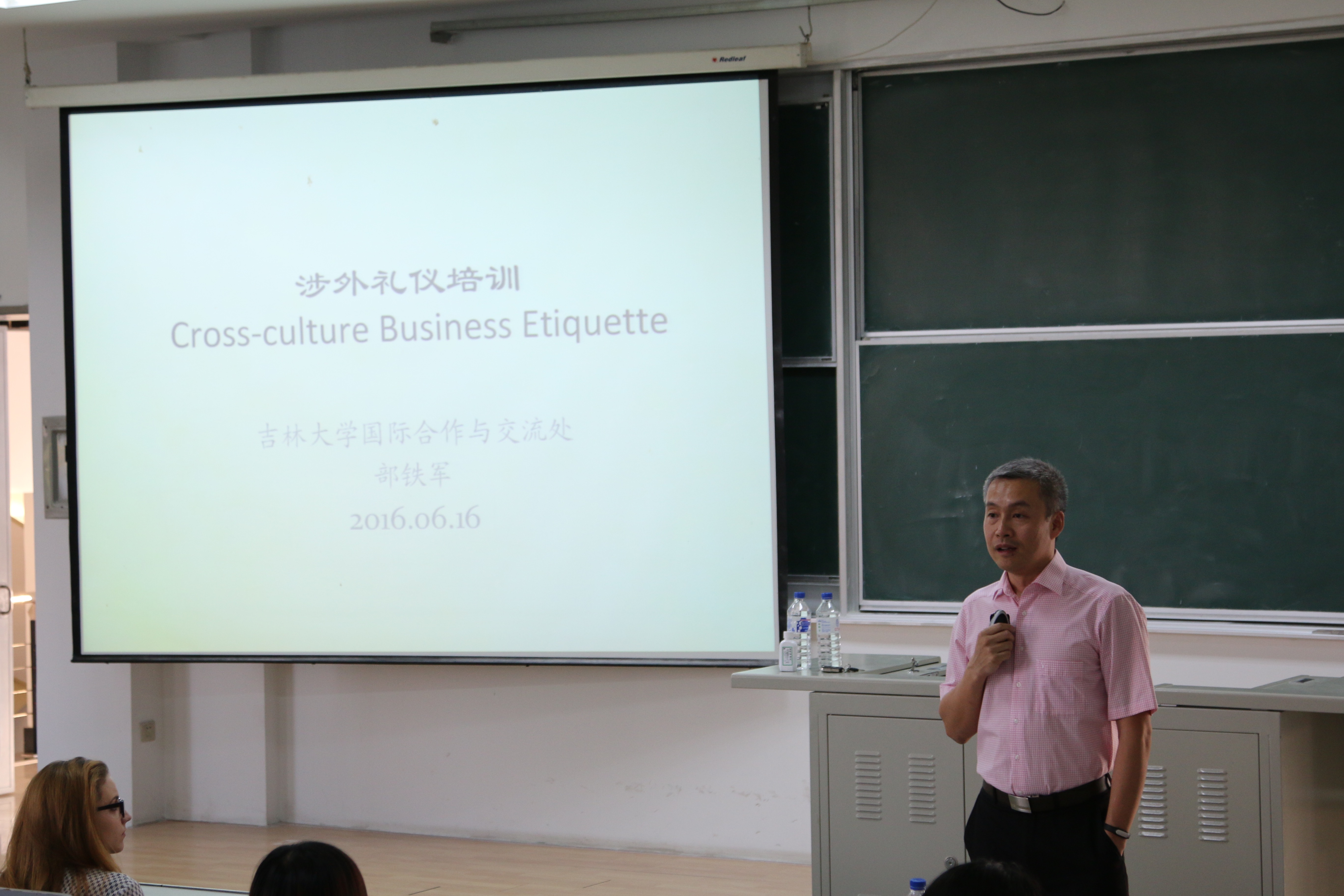 国际处副处长部铁军副教授担任主讲人,培训活动涉及涉外礼仪的多个方面,并配之以丰富的案例,旨在加深同学们对于涉外礼仪的了解与认识。