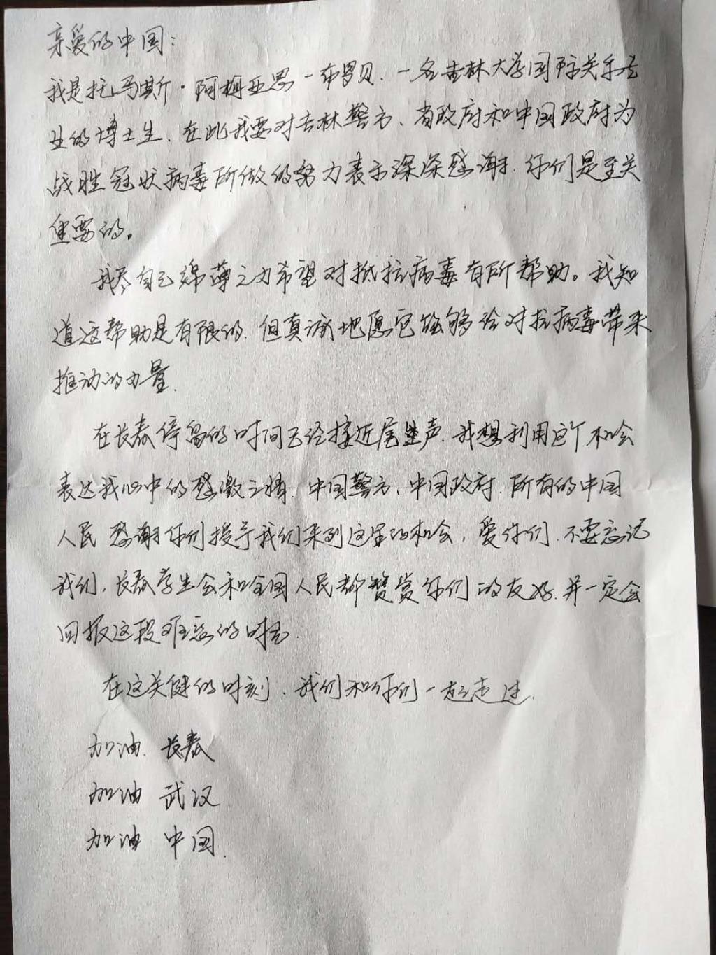 愉快的交谈过后,托马斯掏出了他用中文书写的感谢信。他在信中感谢中国政府、吉林省政府和警方为战胜冠状病毒所做的努力,并深情地写到,“在长春停留的时间接近尾声,希望尽自己的绵薄之力对抵抗病毒有所帮助,感谢中国政府、警方和所有的中国人民给我们机会来到这里,请不要忘记我们,在这艰难的时刻,我们和中国人民在一起。加油,中国!加油,武汉!加油,长春!相信在大家的共同努力下,一定能打赢这场没有硝烟的战争。”随后,前进大街派出所联系学校保卫处和学院,将托马斯的优秀事迹通报给学校,向日本av