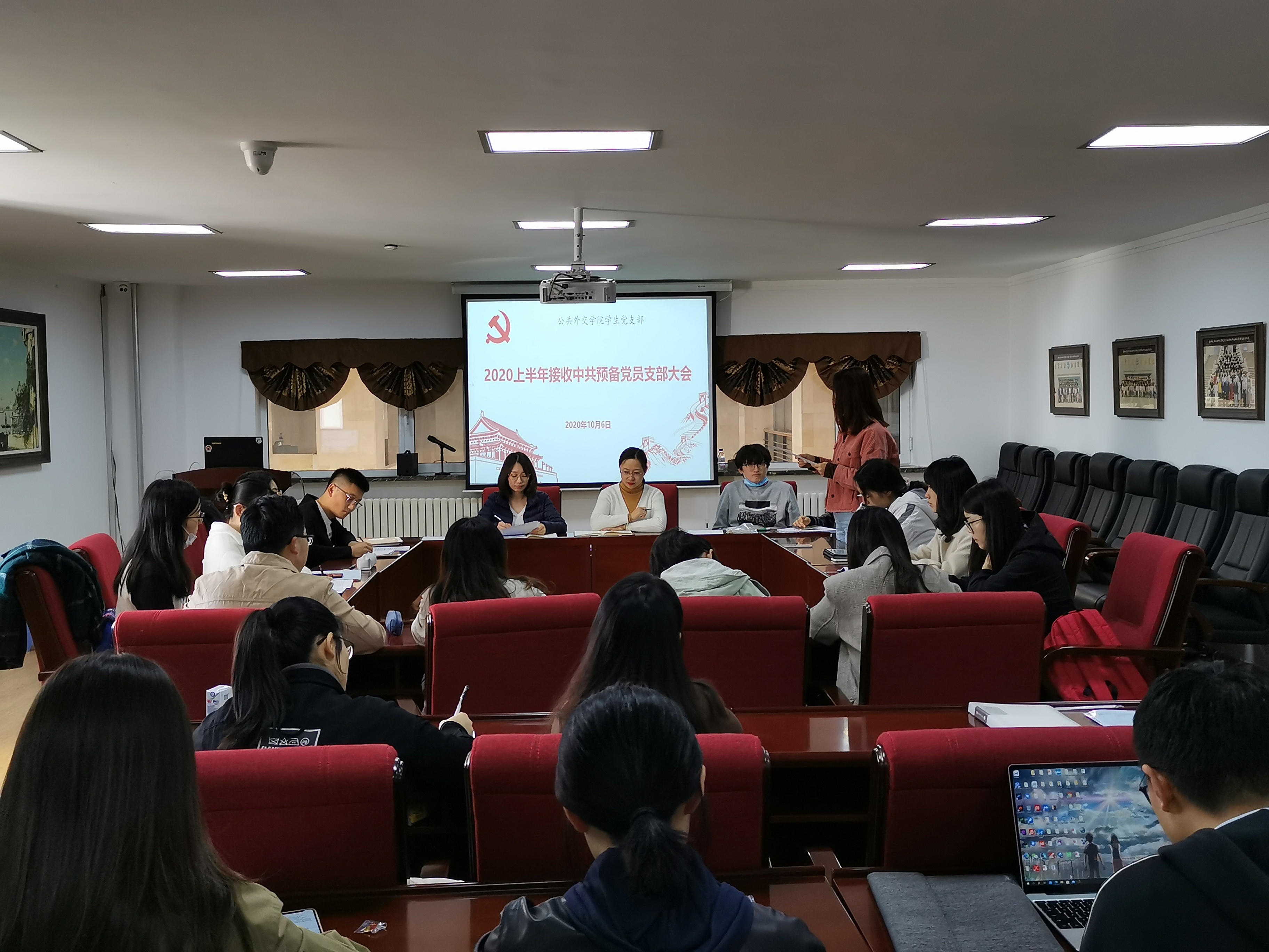 学生党支部在行政楼二楼会议室召开支部大会,讨论关于接收2017级本科生李淑琴、田慧两位发展对象为预备党员事宜。会议由学生党支部书记张淑艳老师主持。