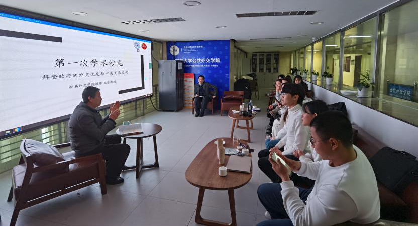 王黎教授以“拜登政府的外交优先与中美关系走向”为题与同学们进行交流探讨。学院党总支书记杨民老师、院团委书记张淑艳老师以及部分教师和学生参与了此次师生沙龙活动。