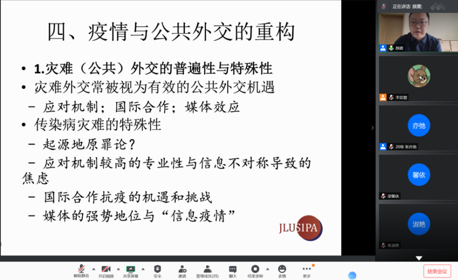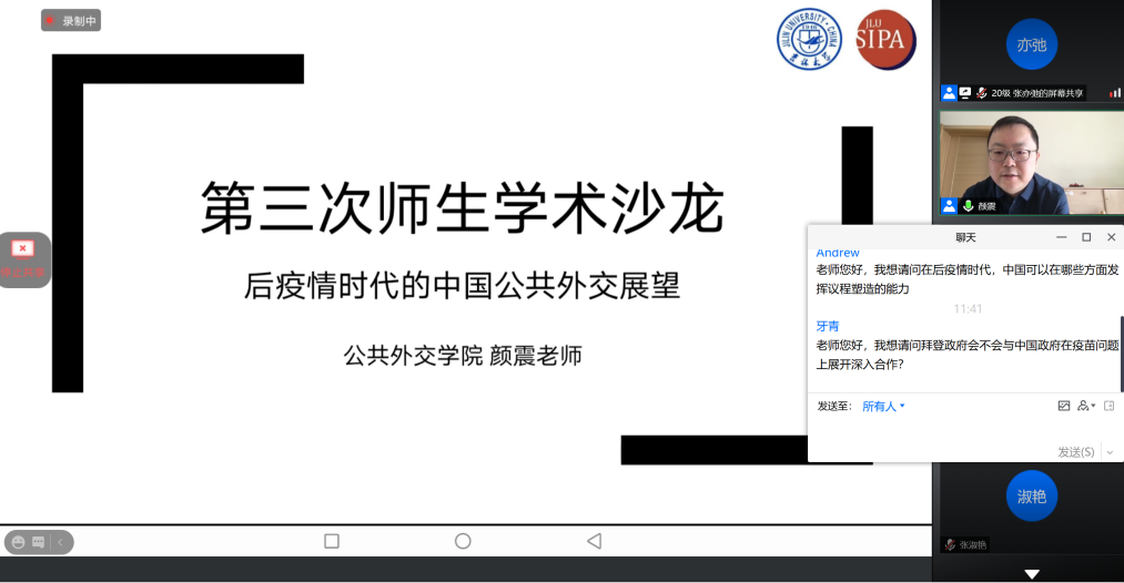 青年教师颜震围绕“后疫情时代中国公共外交的展望”这一主题,分享了他的看法和见解,并与同学们展开深入交流。学院团委书记张淑艳、青年教师陈曦以及学院部分本科生和研究生同学参与了本次师生沙龙活动。