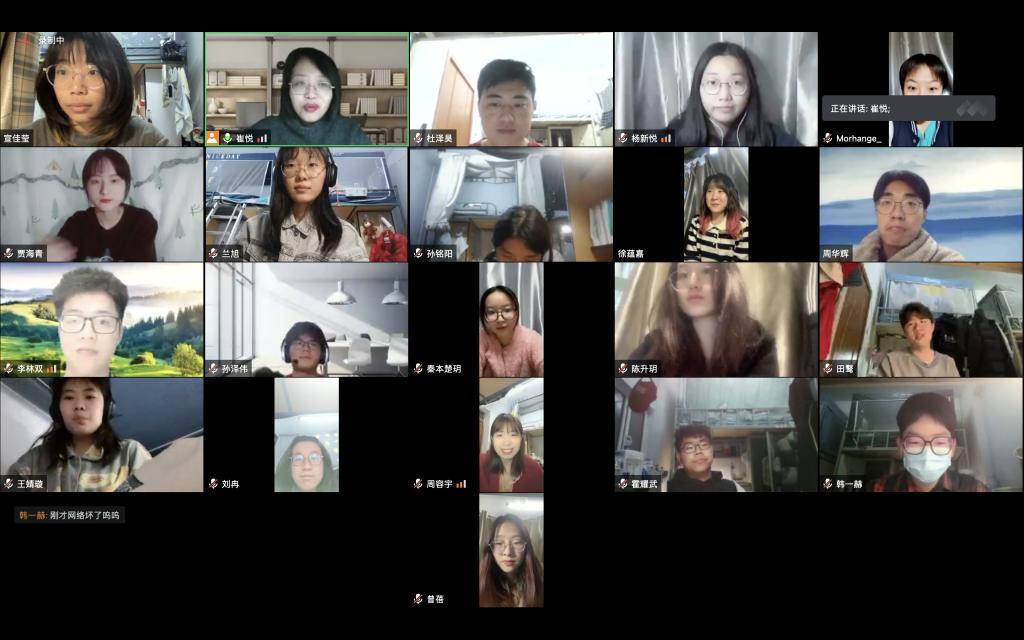 两位班主任老师十分关心同学们的封寝生活,在班会中上纷纷与同学们积极展开聊天互动。同学们结合身边的抗疫故事和志愿者经历,主动分享自己的抗疫心得体会,充分展现了乐观积极的自信心态。霍耀武同学在发言中表达了对搬运物资的志愿者们无私付出的敬意,并表示在需要自己的时候一定挺身而出;兰旭同学对每天上门做核酸的医护人员表示感激感谢他们对全校学生健康的守护;孙泽伟同学分享了自己在寝室封闭期间依然会坚持早睡早起、运动健身……2020级全体同学纷纷展现出有条不紊地安排好学习与生活的信心和决心,并衷心感谢学校各部门与广大驻寝老师们提供的精心呵护。此外,两位老师都在班会中鼓励同学乐观积极应对封校生活,有困难及时向老师寻求帮助,有问题和建议积极向学院、学校提出,并表示学校、学院会积极帮助大家解决问题。