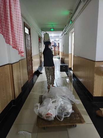 的志愿者们身着白色防护服,口戴N95口罩穿梭于楼层与各个寝室之间,积极协助驻楼老师收集信息、发放餐食、药品、生活品以及各类物资。