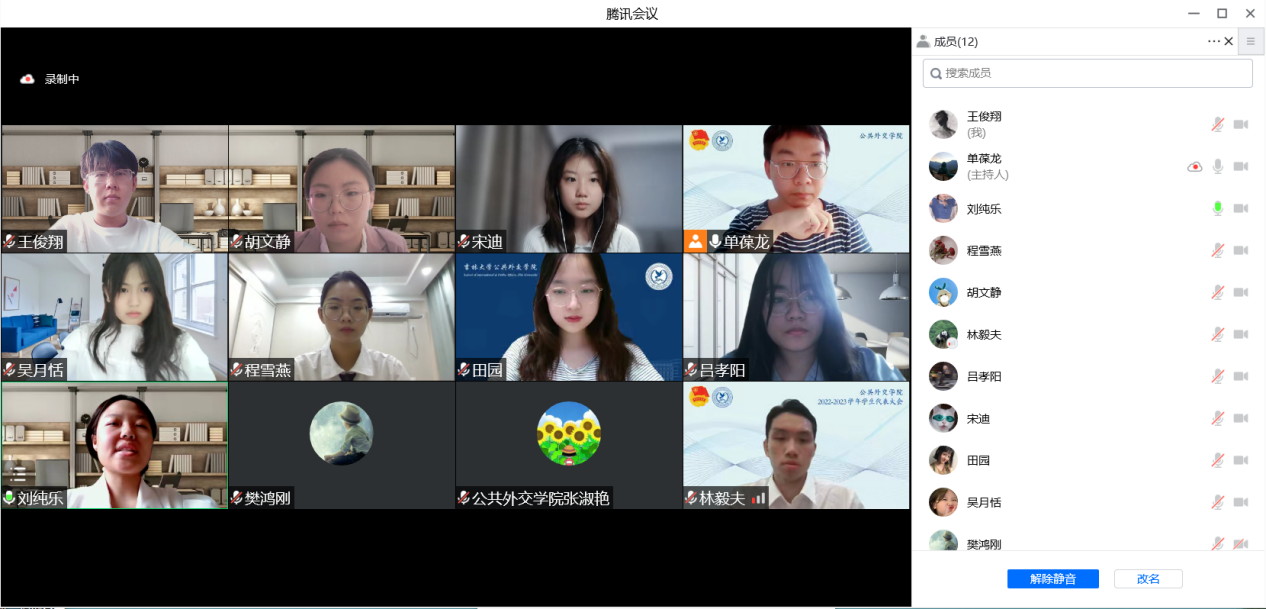 第八届团委、学生会第一次工作会议通过腾讯会议平台顺利召开,会议由主席团成员田园主持。学生工作办公室主任张淑艳老师、辅导员樊鸿刚老师、团委负责人单葆龙老师参加了本次会议。