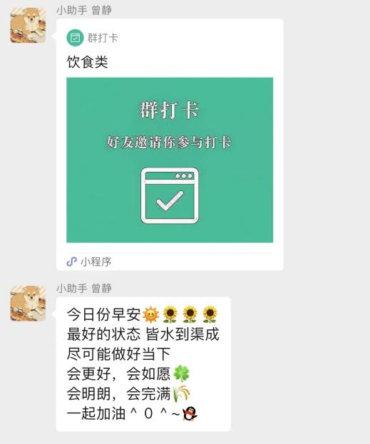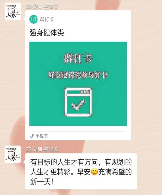 如果要问我这个假期参加的21天健康打卡活动有什么收获,那么我最先想到的回答就是收获了好习惯,管理员每天都会在群里分享打卡小程序,每天可以根据自身情况选择性打卡。既没有强制性完成任务的压力,又能更有动力地完成目标,我通过这个打卡活动,完成了每天背150个单词,运动超过一万步的目标,还做到了每天7点之前起床,可以说是收获颇丰。如果下次还有这种活动,我一定还会参加!