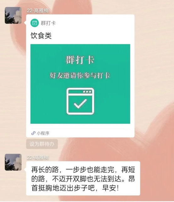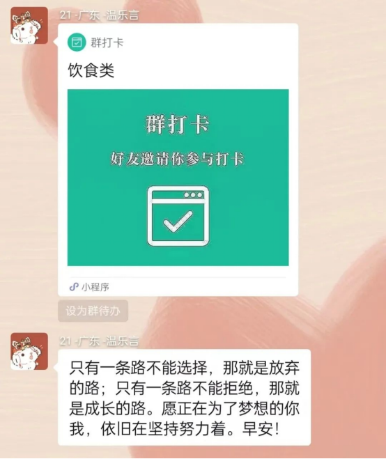 在二十一天打卡活动的助手工作中,我收获了很多。虽然有时统计数据会出错,工作也不是想象的那么完美,但在这样一种实实在在的持续学习的状态中,我感到充实。在每日打卡中,我们感受到新时代青年人的朝气与努力。在这21天里,我们互相勉励、互道早安、共同见证彼此的进步,期待下一次打卡活动的举行。
