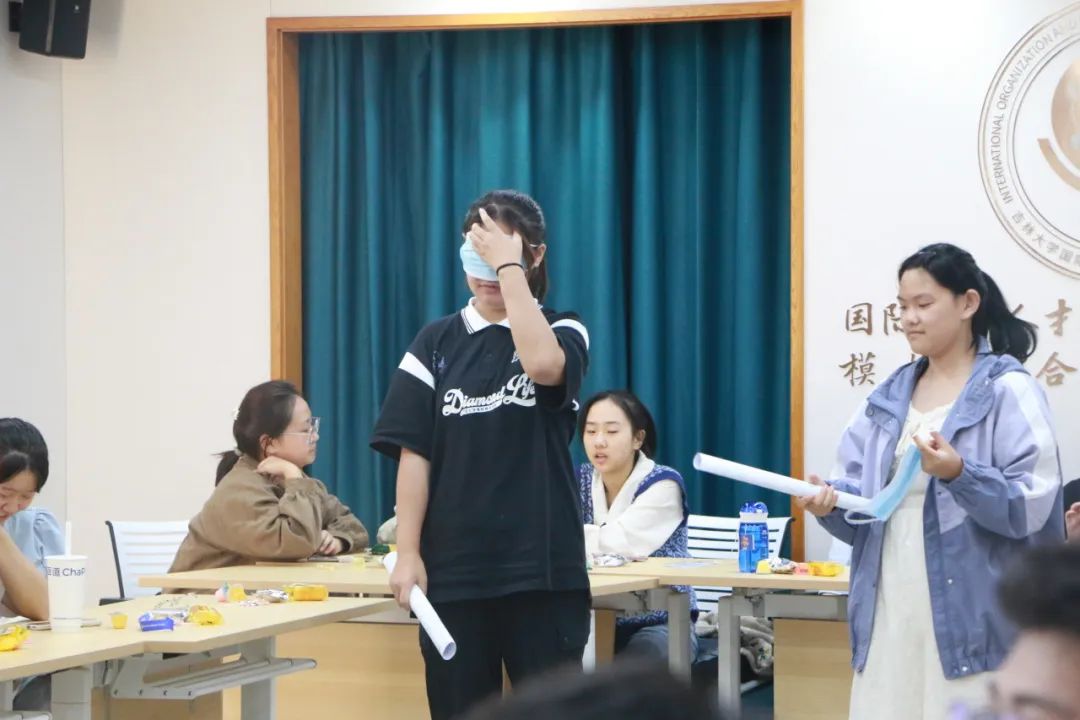 最后一个游戏更是考验同学们的沟通交流能力,根据队友们的指示,被蒙住眼的同学在场上使用纸棒击打对手,以淘汰对方,从而取得胜利。经过前几轮的合作,同学们都已经进行了初步的熟悉与磨合,在后面的游戏中也体现出了完美的团队合作。
