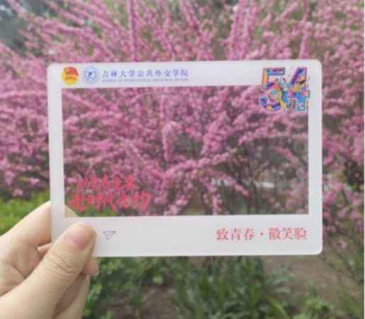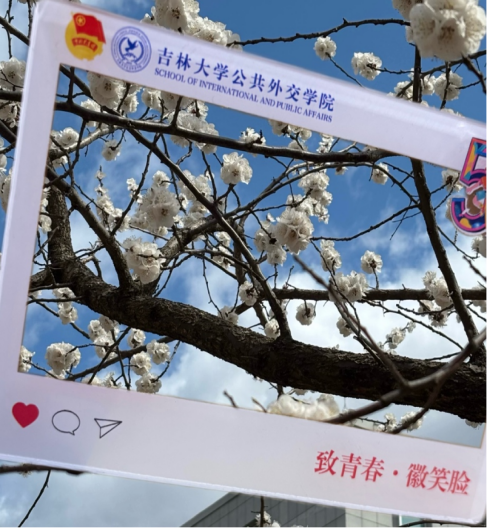 第二张图片拍摄于吉大校园,湛蓝天空下洁白花朵盛放。就像青年人在五四精神映照下纯净热烈,绽放着青春华光。