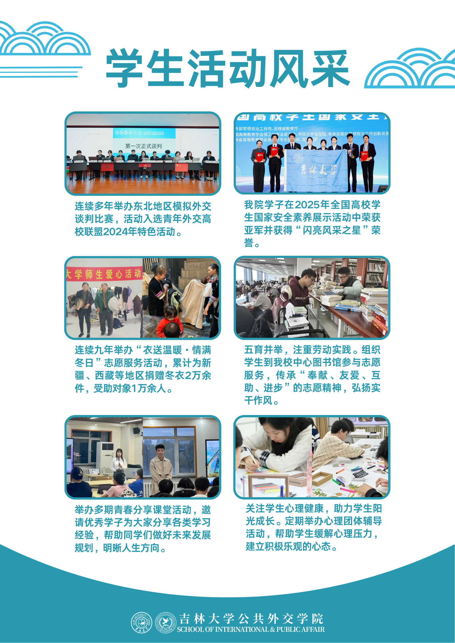 自2014年起招收外交学专业本科生,历届毕业生中,多人到英国剑桥大学、伦敦大学国王学院、伦敦经济学院,美国宾夕法尼亚大学、芝加哥大学、乔治敦大学、罗格斯大学、乔治梅森大学,澳大利亚墨尔本大学,韩国首尔大学等QS全球排名前100或专业排名前100的高校继续深造;或在清华大学、北京大学、人民大学、浙江大学、复旦大学、南京大学、日本av 等国内知名学府攻读硕士研究生;或在新华社、三星公司、中国工商银行、今日头条、国家部委、知名中学等企事业单位就业。多名同学选择去新疆和西藏基层就业,多名同学进入中华人民共和国外交部及其直属专业研究机构工作,外交学子用实际行动践行“世界眼光,家国情怀”的院训,让青春之花绽放在祖国最需要的地方。